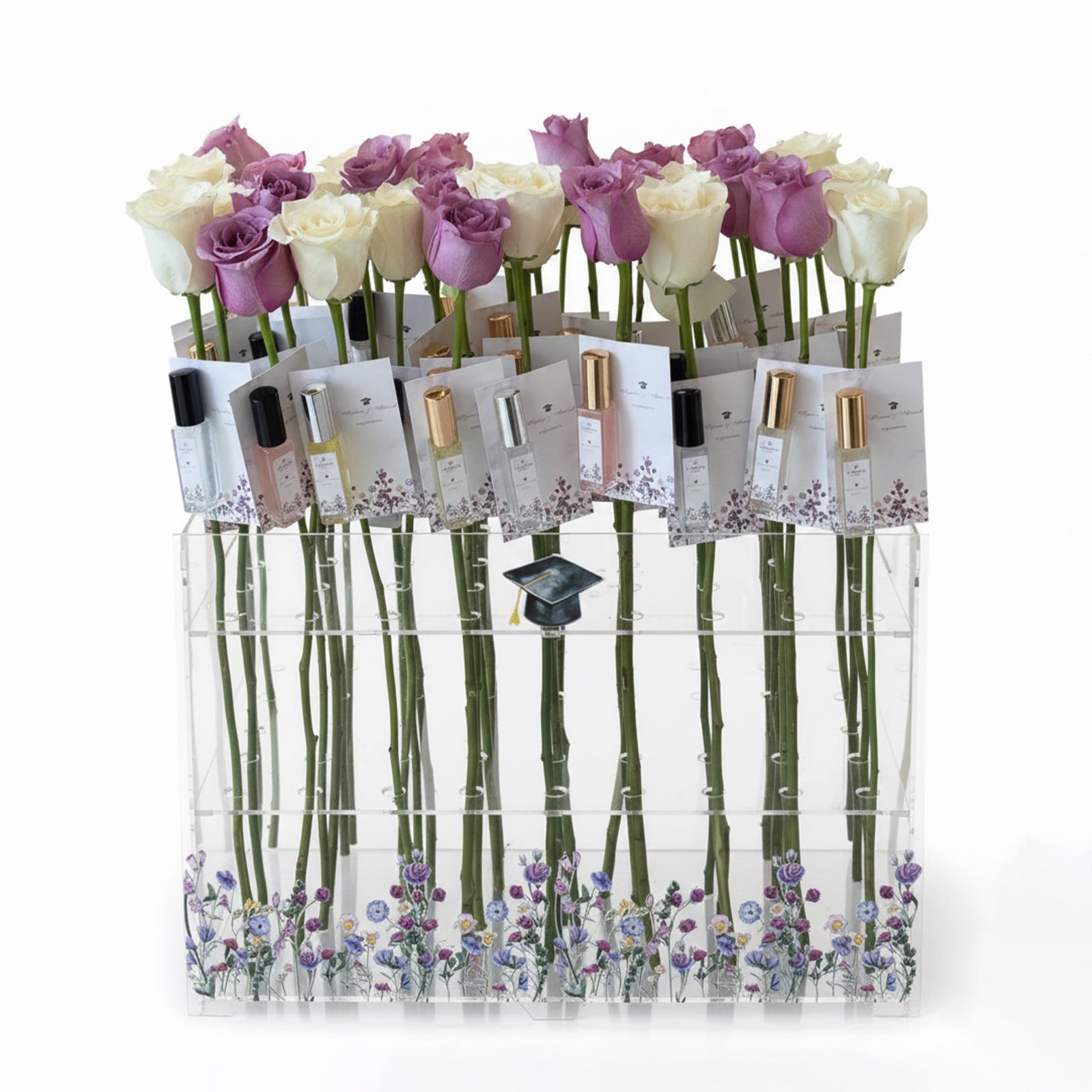 قدّم هدية تبقى بالذاكرة… باقة ورد طبيعي مع عطر فخم من إيفوريا، مُرتَّبة على ستاند أكريليك أنيق يبرز جمال الورد ولمسة العطر